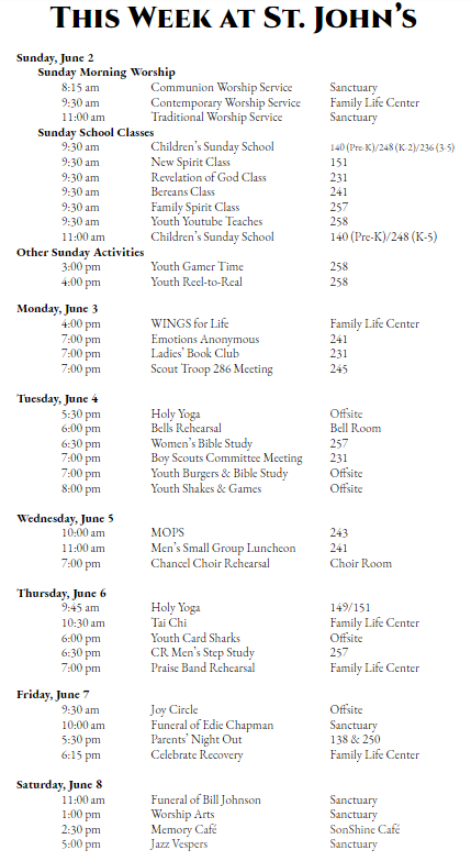 See what’s happening in June for missions at St. John’s! Come by the Hospitality Center to pick up your copy.