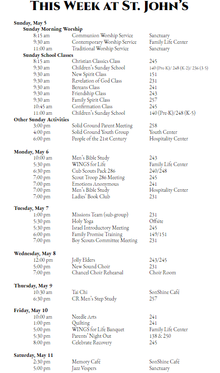 See what’s happening in May for missions at St. John’s! Come by the Hospitality Center to pick up your copy or download
