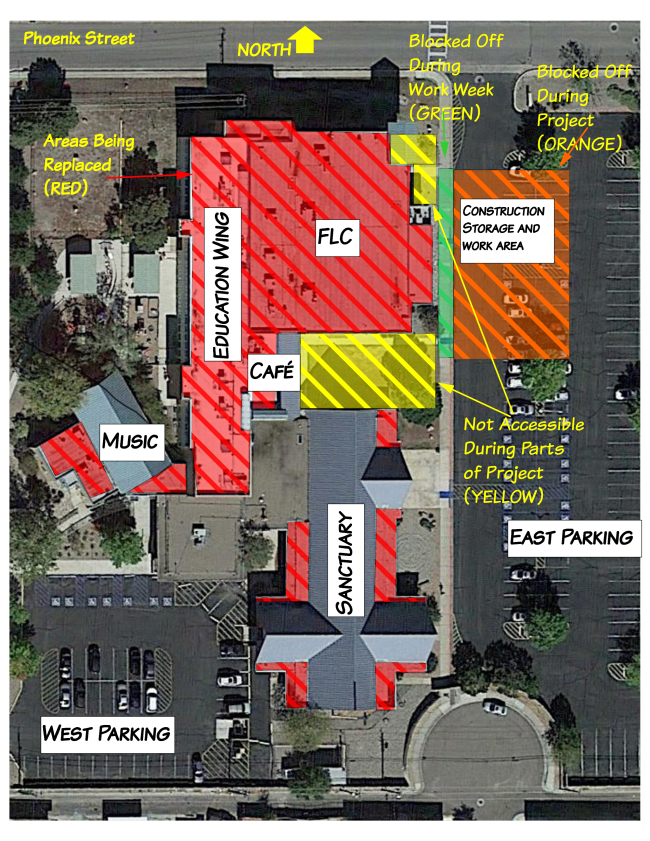 Construction on the new roof started on February 3, 2020. St. John’s United Methodist Church will be replacing all the “flat” roofs on the church. The red area on map shows which areas are being replaced. Construction is anticipated to take approximately two to three months (weather permitting) and will be completed in phases! Please find more information