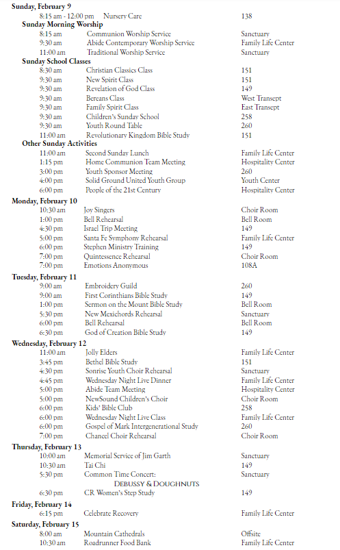 The next Casa Esperanza Dinner will be Tuesday, February 18 at 5:30 pm. This ministry provides a meal to the many caregivers and patients that have to be away from the comforts of home. Please sign up, to provide food or help serve, in the Hospitality Center or at the Abide Service. Contact Jenn Shields at jennshields200@yahoo.com or 505-450-9978 for more information.