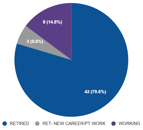 A smaller percentage are still working and semi-retired as realtors, gallery assistants, environmental attorneys, hotel professionals, chefs, retail workers, and more — yet still carve out time to serve.