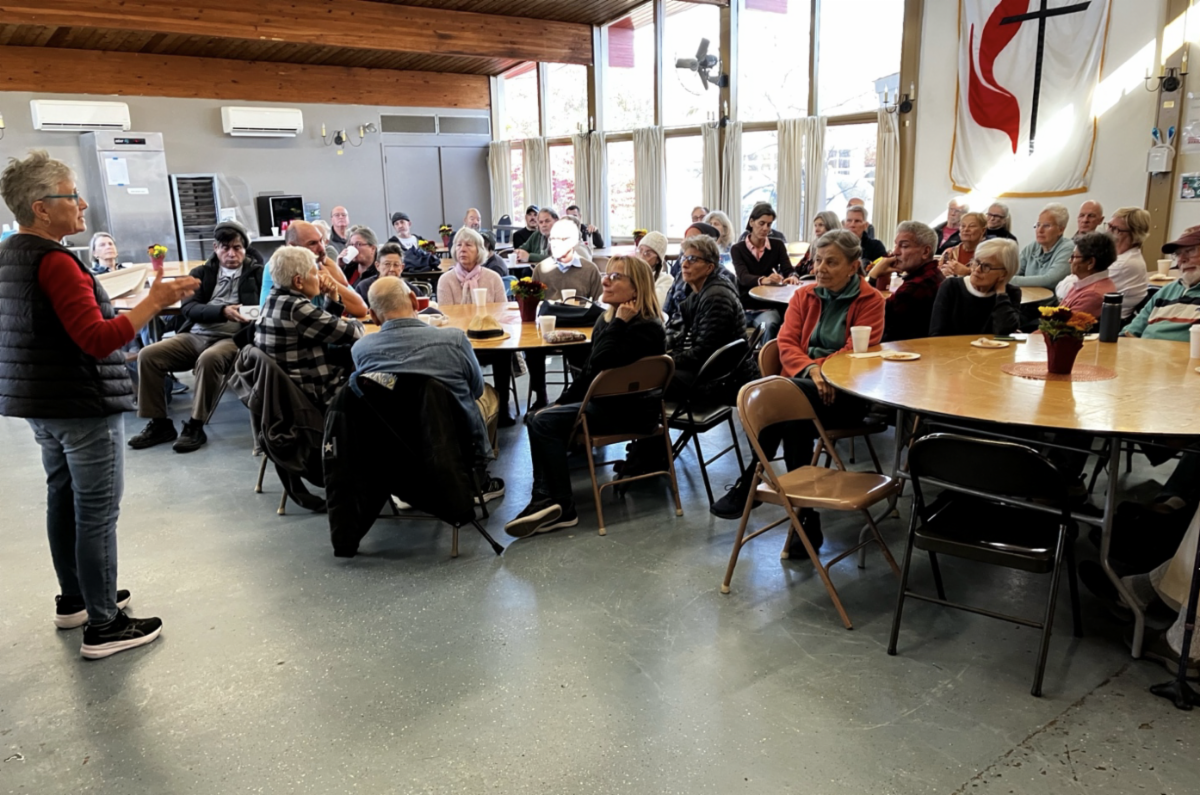 Lunch will be served Monday through Friday, from 12:30 PM until 1:30 PM. Returning to our efficient pre Covid system, guests are free to select one meal to eat at dining-room tables or to take out. They can get second helpings if they are available at 1:15 PM. Friday to-go meals for the weekend will be available starting December 13.