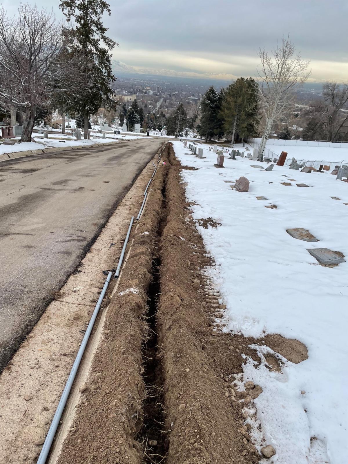 Trenches, like the ones shown in the photo, will be dug within and adjacent to the roadways in the cemetery. Gravesites will not be affected by this project.