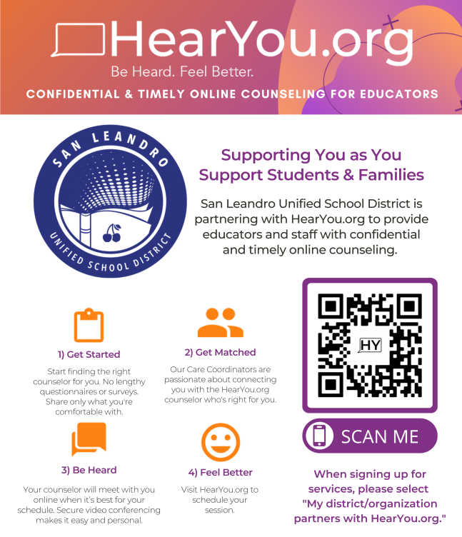 SLUSD is offering another opportunity for free counseling to our employees. See the flyer below to take advantage of three free sessions, but don't hesitate. There is a limited number of spots available.