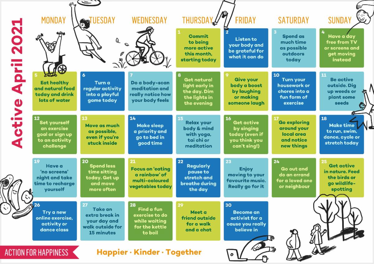 This month we're encouraging you to get active, get outdoors and take care of your body! Let's reap the benefits of getting our bodies moving and breathing more deeply as a result of exercising, laughing, and even singing! We don't all need to run marathons - there are simple things we can all do to take care of our bodies - for example unplugging from technology, getting outside and - importantly - making sure we get enough sleep!