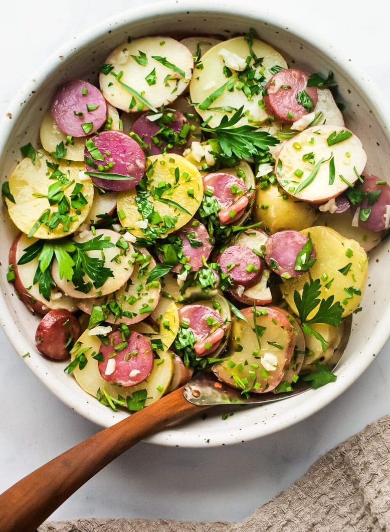 This salad is loaded up with fresh herbs – tarragon, parsley, and chives and dressed in the most flavorful Dijon Vinaigrette. It’s vegan, with no mayo, and quick and easy to make. Healthy and light!