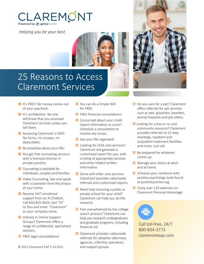 | | 25 reasons to use your EAP benefits | Through our Claremont Employee Assistance Program, you and your family have access to free, confidential support for life’s challenges—big or small. You can connect with a licensed counselor (in person or by video), access 24/7 emotional support through an AI chatbot, and explore online tools to manage stress and build resilience. Claremont also offers free legal and financial consultations, childcare and elder care referrals, and over 120 personal growth webinars. Call 800-834-3773 or visit claremonteap.com to get started anytime. | | November 13 is World Kindness Day | |