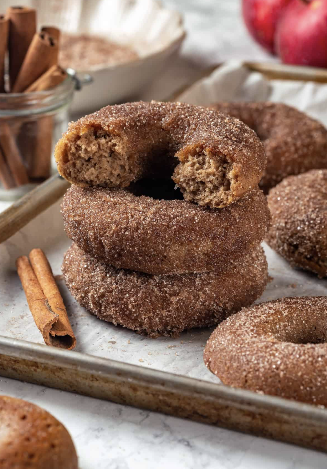 These tender, cinnamon-spiced apple cider donuts are baked instead of fried and made without yeast, so they’re easy and quick to make.
