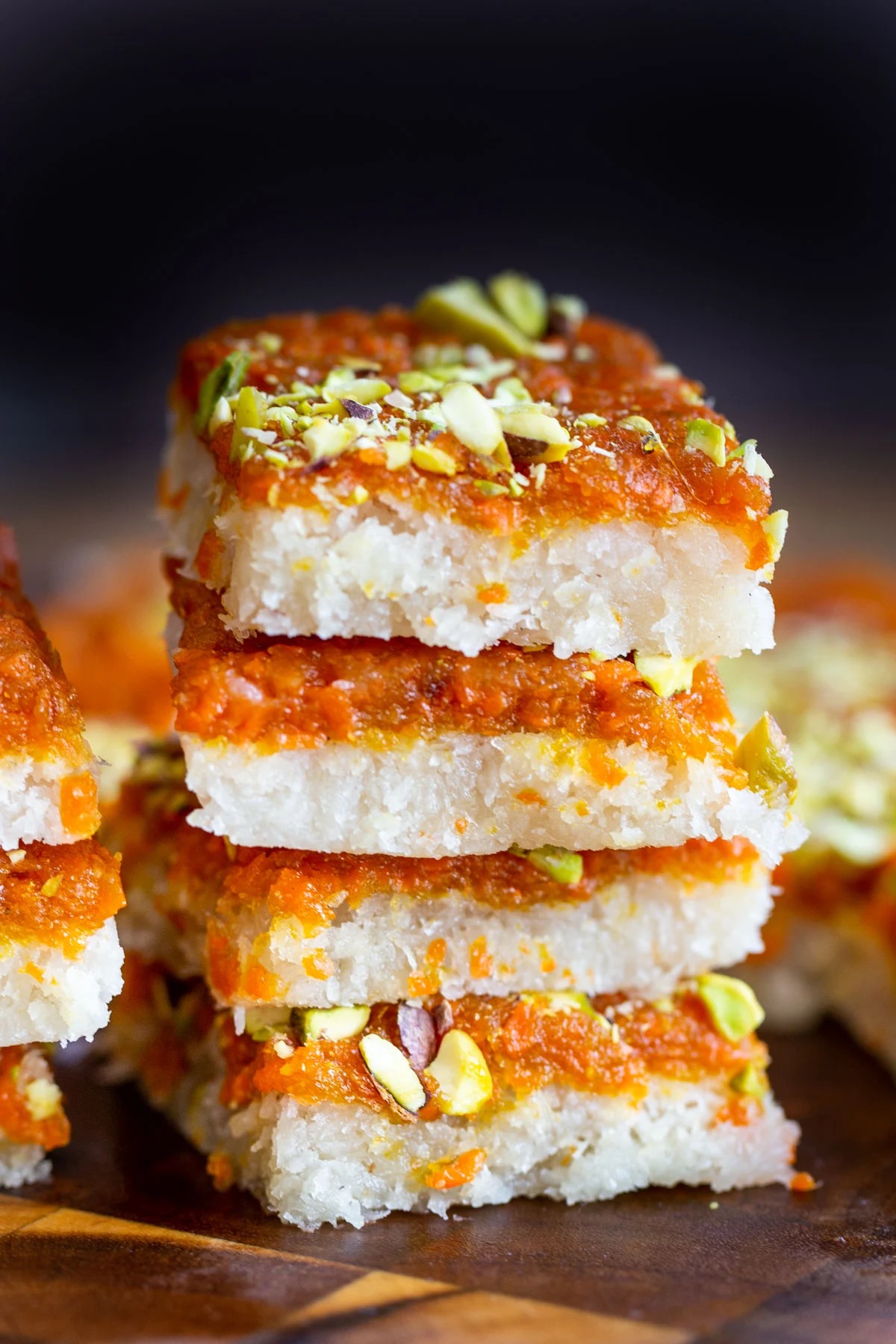 - Take the pan out of the fridge. Transfer the carrot mixture to the pan and press and spread it evenly on top of the coconut layer using a spatula. Top with chopped pistachios, and press them in. Chill the Burfi for an hour, remove the Burfi bars using the parchment, then slice and serve.