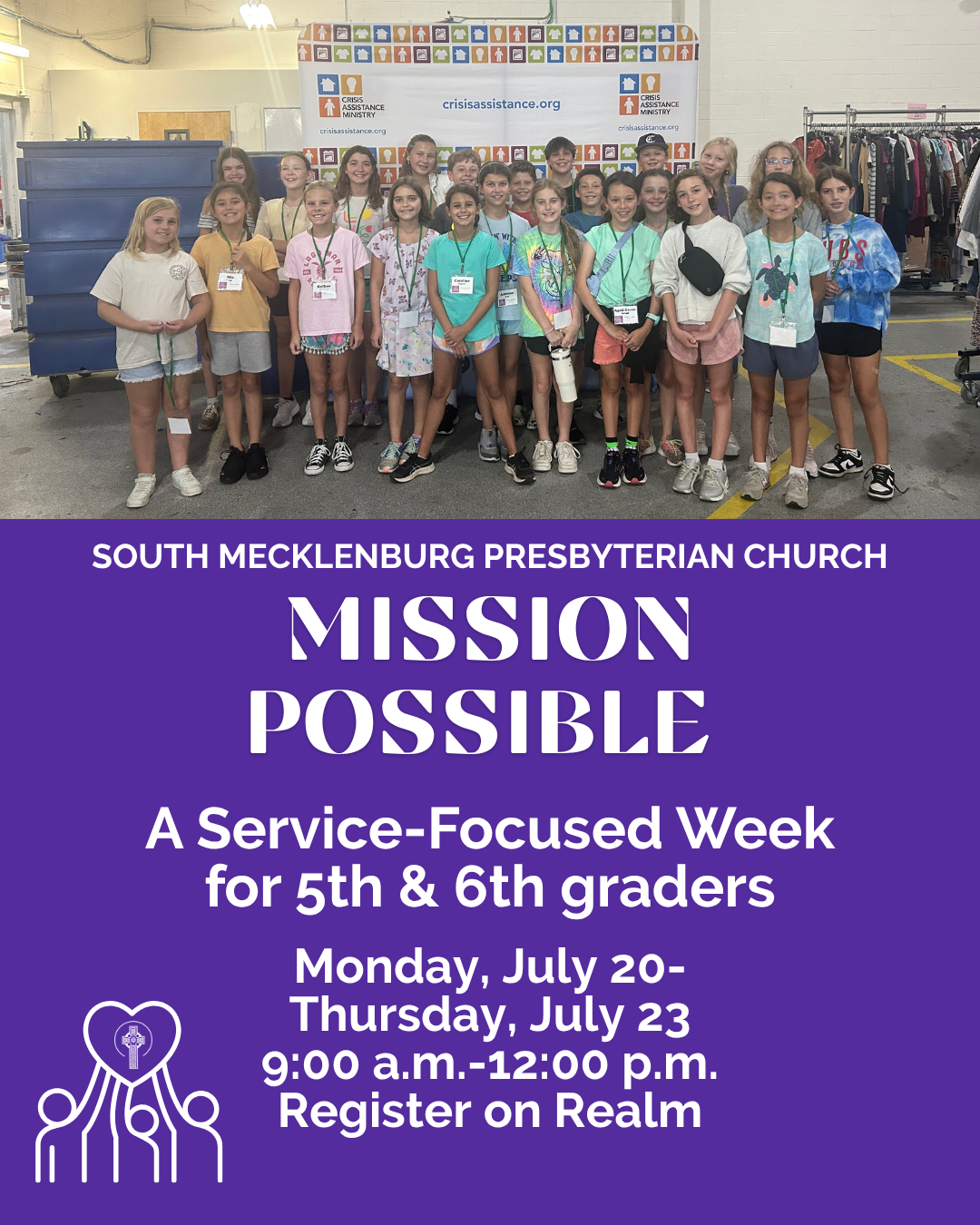 Monday, July 20-Thursday, July 23, 9:00 a.m.-12:00 p.m. - VBS is a FUN week of exploring the Bible through play, art, science and music! Mission Possible is our program for 5th and 6th graders that involves a week of fun and service.