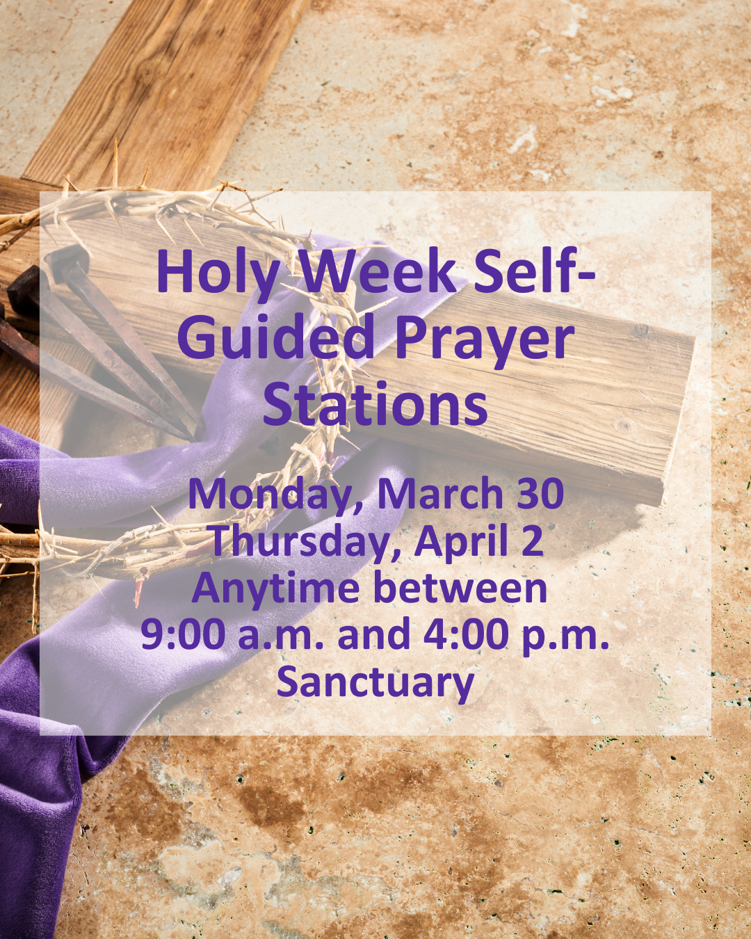 Monday, March 30-Thursday, April 2, anytime between 9:00 a.m.-4:00 p.m. (church office hours), Sanctuary -Journey through Holy Week with self-guided prayer stations. Please note: the sanctuary doors will be locked. Please enter through the church office. | Contact: Rebecca Guzman or Lindsey Odom