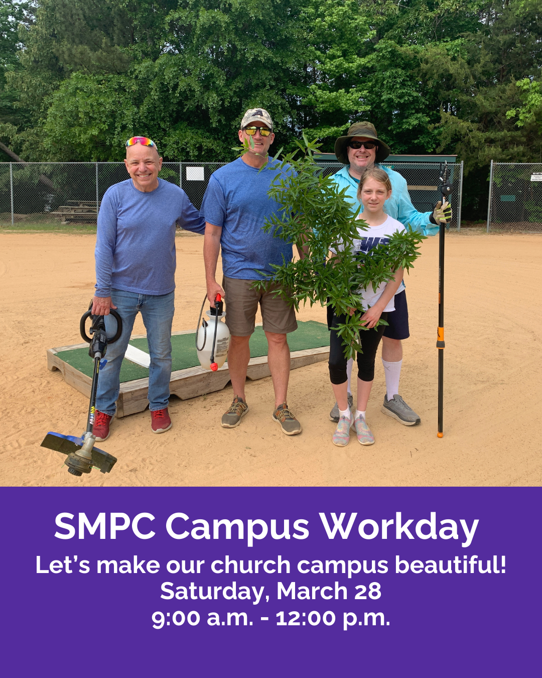 Saturday, March 28, 9:00 a.m.-12:00 p.m., SMPC Campus - Many hands make light work! Come help us make SMPC's campus beautiful as we welcome all for Easter Sunday worship! Please bring a hat and gloves. | Contact: Andy Burke