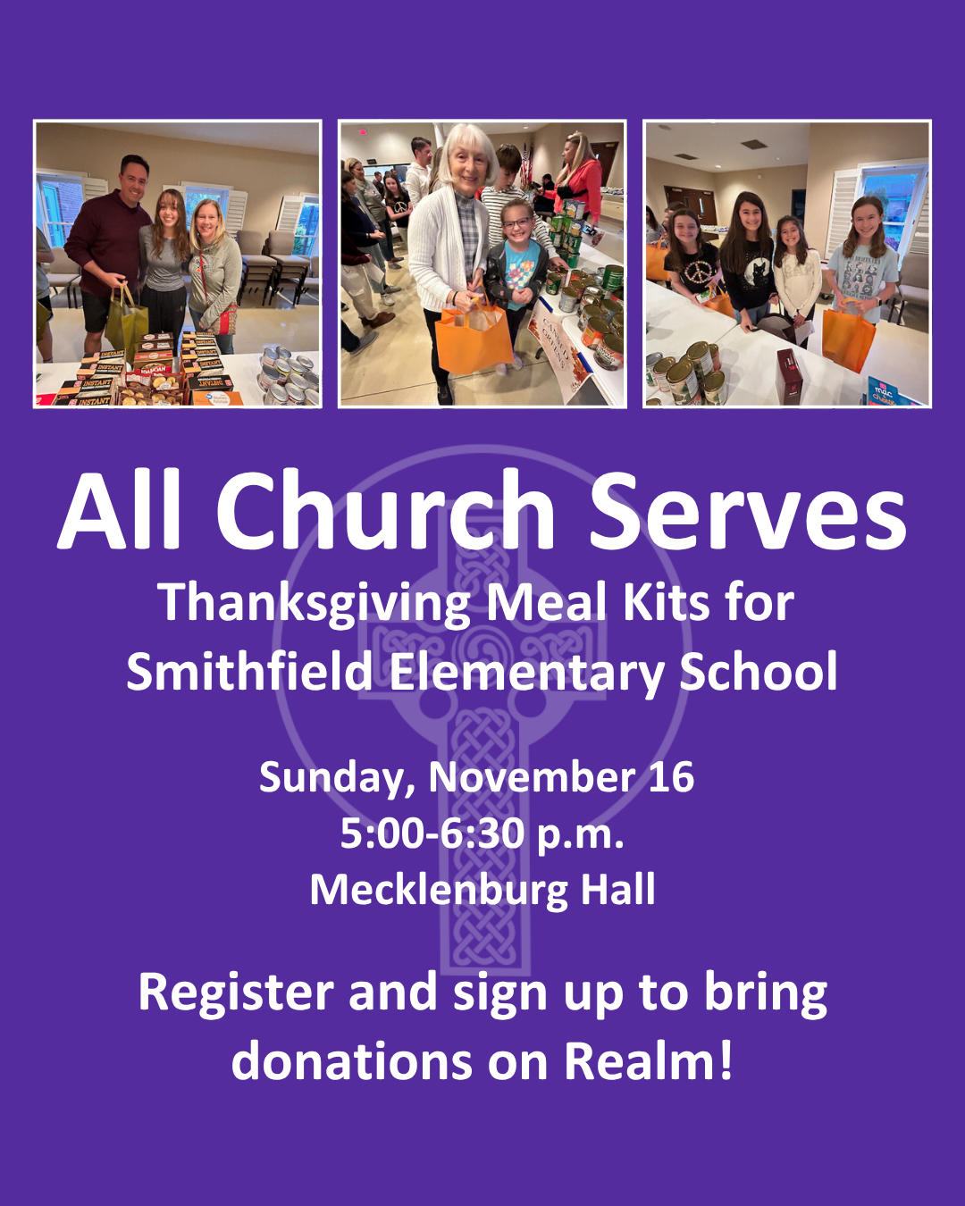 Sunday, November 16, 5:00-6:30 p.m., Mecklenburg Hall - All ages are invited to make Thanksgiving meal kits for families of Smithfield Elementary School students. Our goal is to make 40 meal kits. Register and sign up to donate on Realm. | Contact: Lindsey Odom