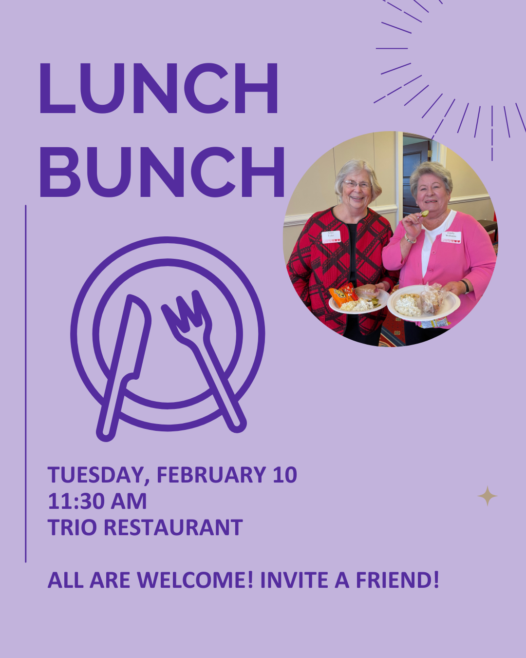 Tuesday, February 10, 11:30 a.m., Trio Restaurant, 10709 McMullen Creek Parkway, Charlotte, NC 28226 - Join this group that meets informally four times a year for lunch and fellowship! All are invited - bring a friend! | RSVP to Ruth Ann Engel by Sunday, February 8 or sign up on Realm.