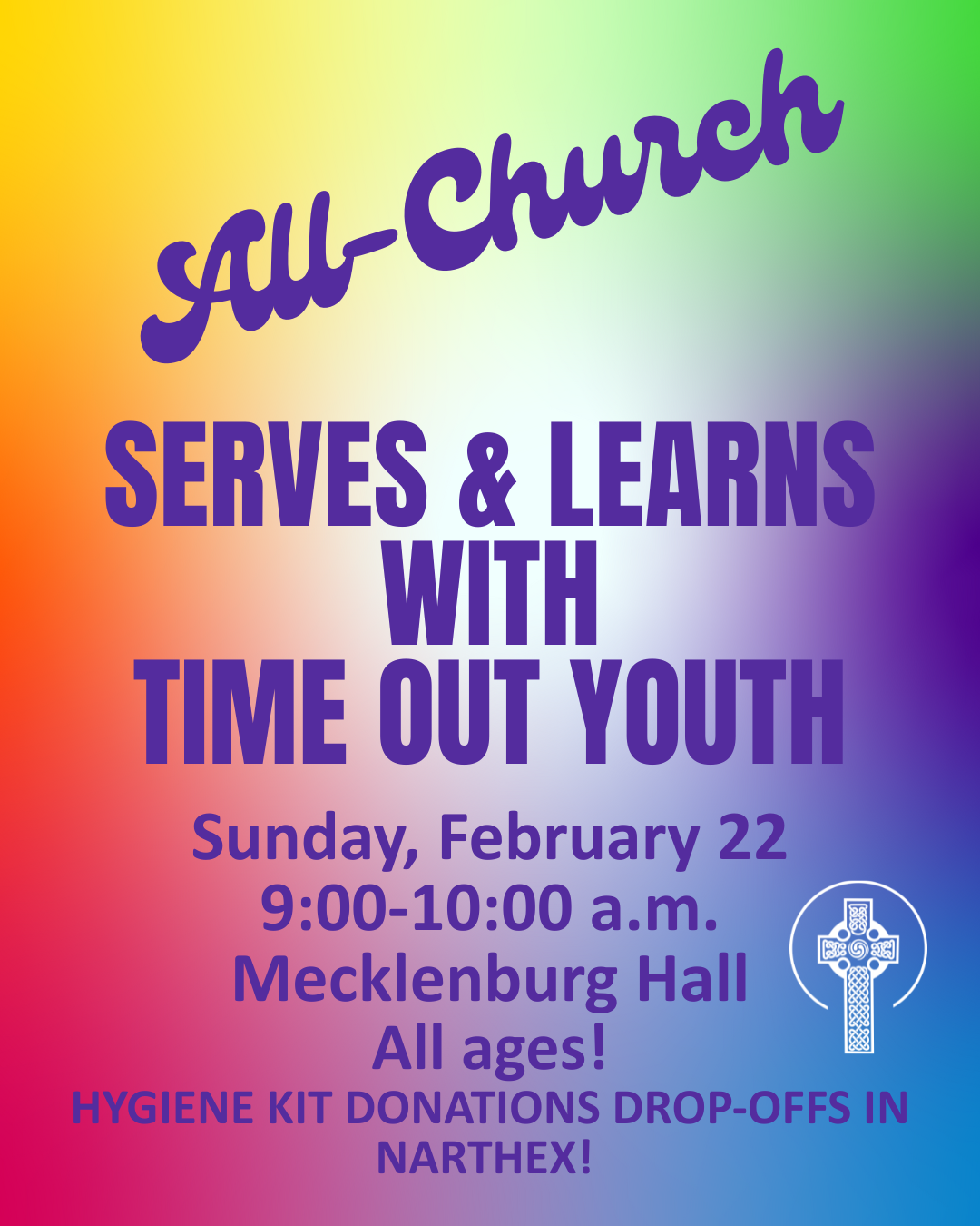 Sunday, February 22, 9:00-10:00 a.m., Mecklenburg Hall, All Ages - Join us for a special intergenerational service and learning opportunity as we partner with Time Out Youth, an organization dedicated to creating affirming, supportive spaces for LGBTQ+ youth in our community. We will welcome their team to SMPC for a morning of hands-on mission, education and connection. Beginning this Sunday, February 1, we are collecting full-size bottles of shampoos, deodorants, body wash and other hygiene essentials like combs and socks for TOY’s Life Essentials Closet. There are bins located in the narthex! We’ll be assembling hygiene kits during our hour of service and learning! | Register | Contact: Lindsey Odom
