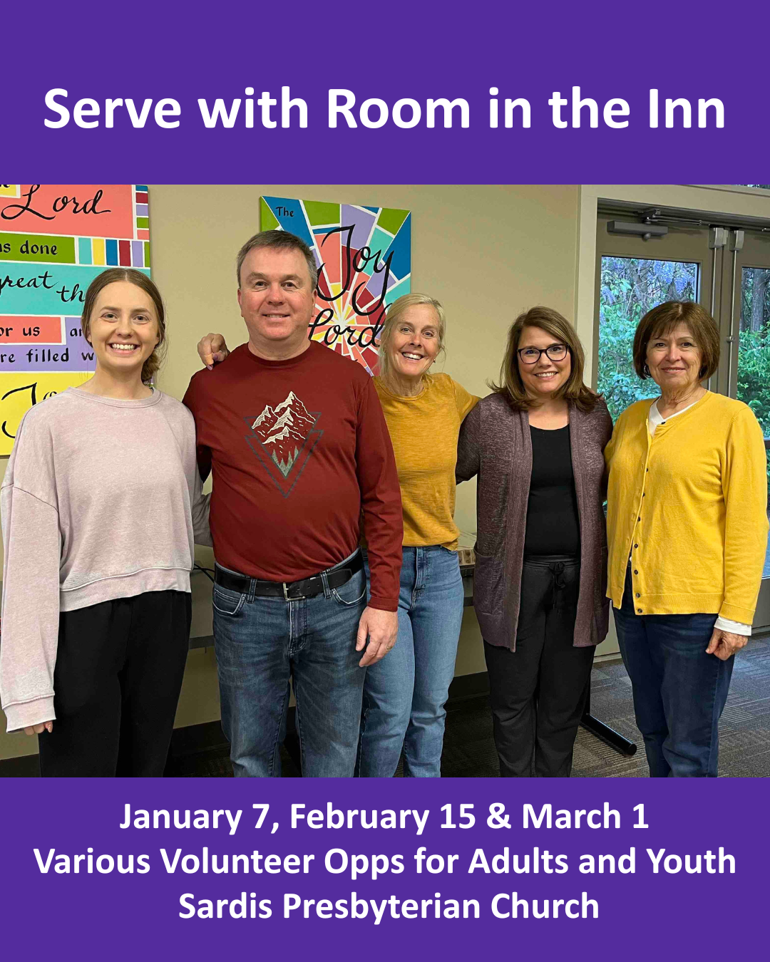 Sunday, February 15, Sardis Presbyterian Church - We partner with two other churches to help with dinner, overnight stays, breakfast, and cleanup. We encourage youth to sign up for this volunteer opportunity! Room in the Inn is an initiative led by Roof Above. Additional volunteer date is Sunday, March 1. | Sign Up | Contact: Amy Matthews