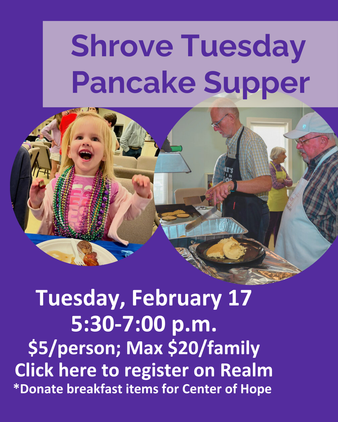 Tuesday, February 17, 5:30-7:00 p.m., Mecklenburg Hall, All Ages - Bring your family and friends for a pancake feast as we prepare to journey through the Lenten season together. We will collect food donations to support our Center of Hope ministry: pancake mix (add water variety), syrup, Tang drink mix or lemonade and quick grits. $5/person (maximum family cost of $20). | Register on Realm. | Contact: Melissa White