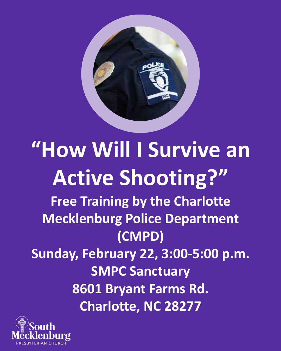 Sunday, February 22, 3:00-5:00 p.m., Sanctuary - We invite you to attend a free safety training led by the Charlotte-Mecklenburg Police Department (CMPD), “How Will I Survive an Active Shooting.” This two-hour training is designed to empower participants with practical, option-based skills to help them respond to a violent incident and stay safe until law enforcement arrives. The information shared applies to many settings—including places of worship, workplaces, schools, and public spaces. The presentation is high-energy and interactive, with demonstrations and discussion. There are no hands-on training situations or surprise scenarios. All are invited - friends welcome. RSVP here. Contact: Adrienne Jaquith