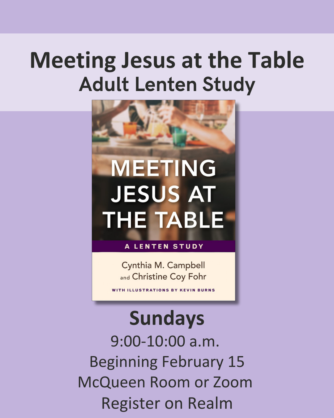Sundays beginning February 15, 9:00-10:00 a.m., McQueen Room or Zoom - A seven-week study with Meeting Jesus at the Table: A Lenten Study that provides Biblical insights along with thought-provoking queries regarding our own time, such as whom should we invite to Sunday dinner and who is left out and left behind in our culture today. | Register on Realm. | Contact: Melissa White