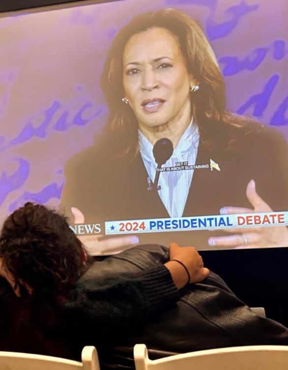 The roaring applause and howls of laughter emanating from the Bordy Theater on Tuesday night weren’t the result of a comedy show or film screening – they were from the debate between Vice President Kamala Harris and former president Donald Trump. Prior to the watch party, Communication Studies Chair Gregory Payne and Journalism Chair Lu Ann Reeb fielded questions from students, with Boston Globe political reporter Emma Platoff.