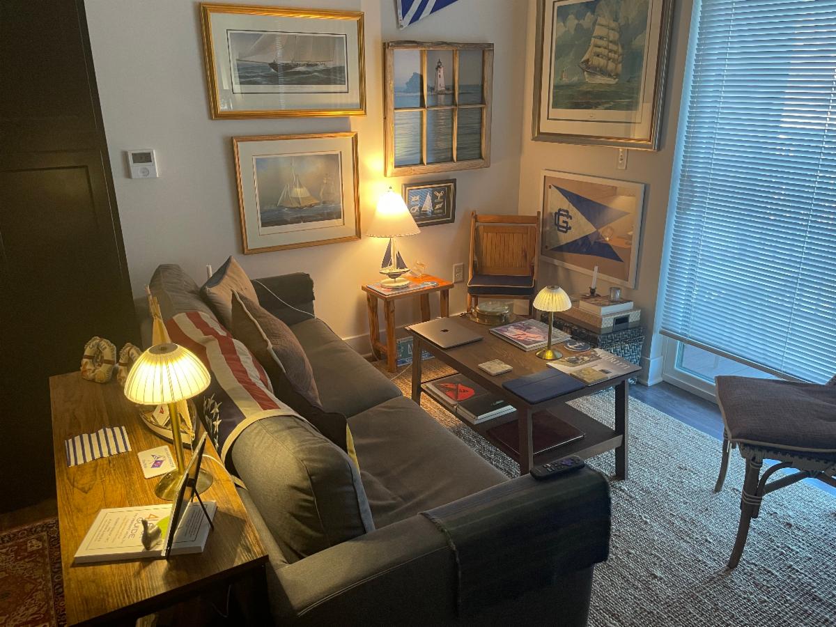 | | It's a thoroughly modern kitchen with all the amenities... | On to the living room with an outdoor deck... | The living room features lots of nautical art... | On to the MBR below: with laundry and walk-in closet... | |
