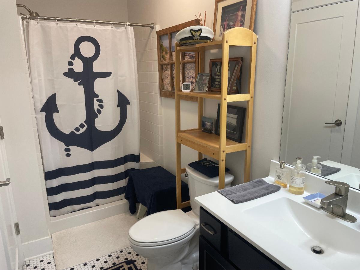 The nautical theme continues in the bathroom, featuring my Coast Guard officer's hat on the top shelf. | |