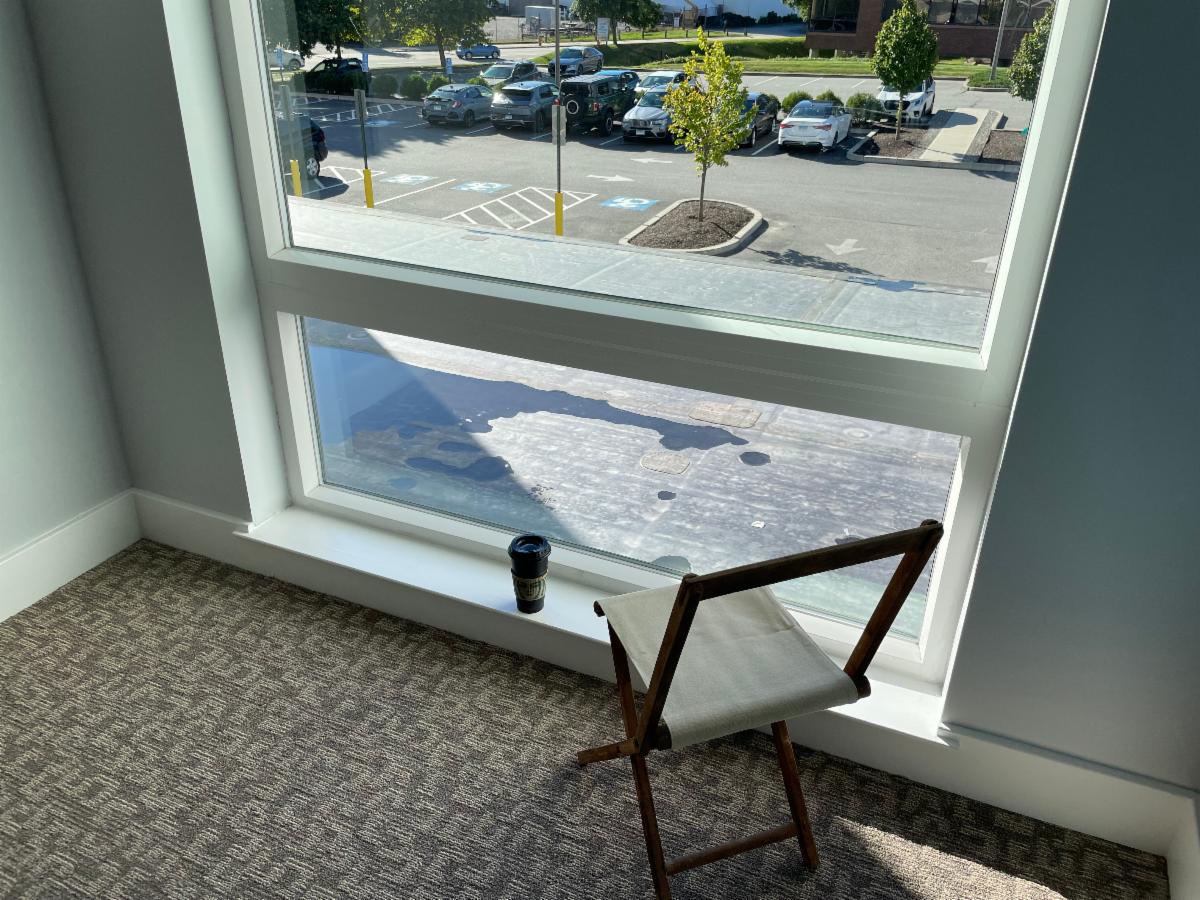 Below, in the hallway right outside my door, this is a nice place to sip my coffee while keeping an eye on my car in the parking lot -- while enjoying a view of the marina and trains rolling by on the nation's busiest rail corridor... | |