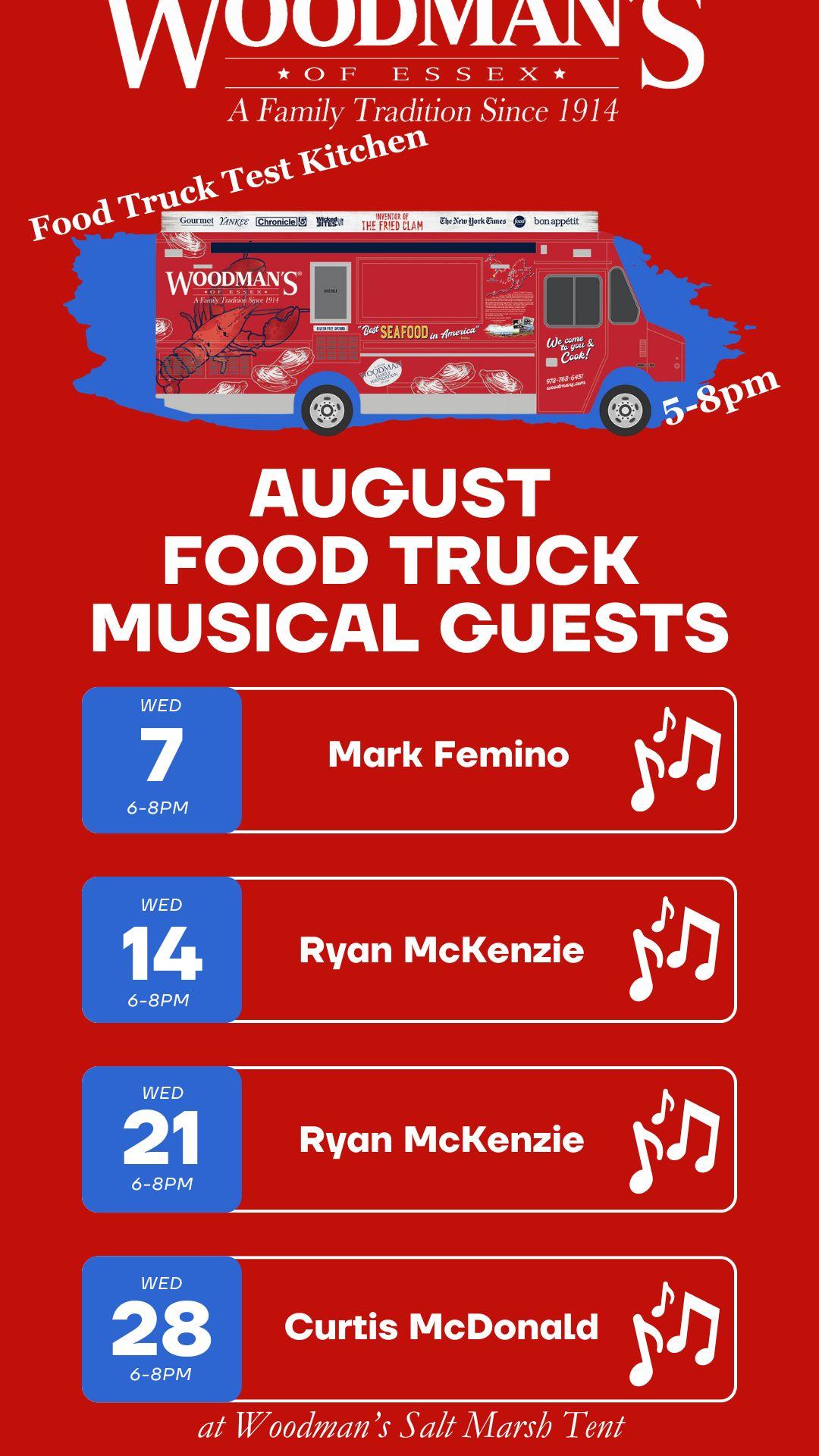 Come enjoy food from Woodman's Food Truck Test Kitchen and Live Music at the Salt Marsh Tent tonight and on Wednesday nights in August!