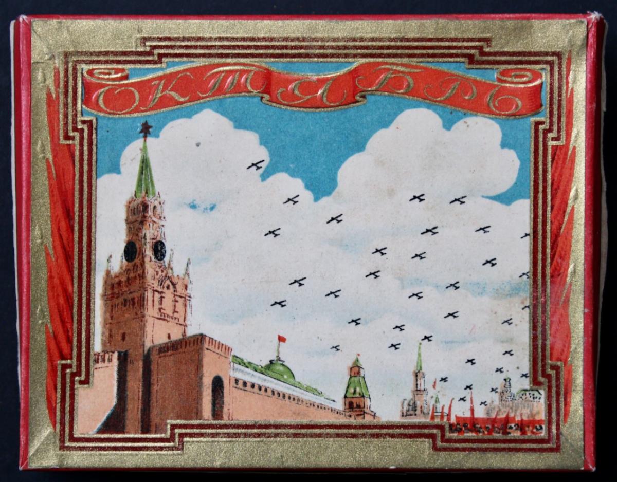 This collection of cigarette boxes highlights Soviet product packaging design largely from the 1920s-30s with some examples from the later decades. The designs span overtly political themes, nationalistic topics, far flung regions and the purely fanciful.