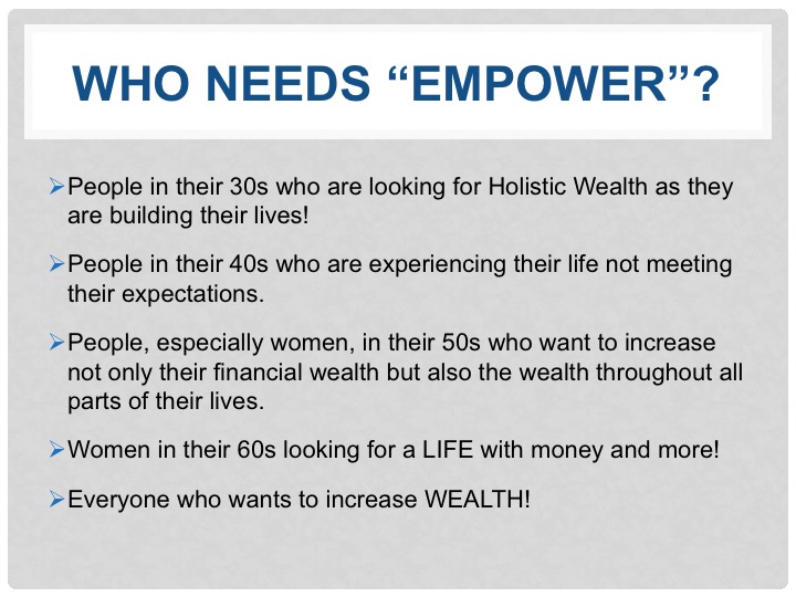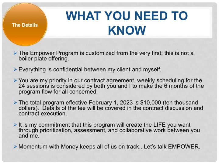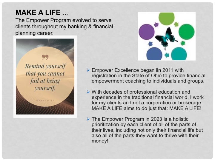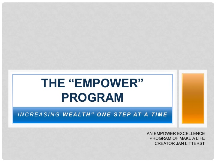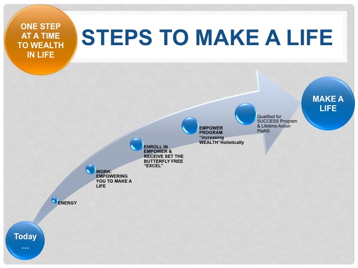 WORK: With your ENERGY, the step Empowering YOU to MAKE A LIFE is your Introduction to THE EMPOWER PROGRAM with a valuable peek into a part of your own LIFE familiarizing you with the Wheel of Life Assessment allowing you to prioritize a life area and create a solution and action plan to increase wealth one step at a time. You have shared your ENERGY, and Empowering YOU to MAKE A LIFE is my gift to share with you.
