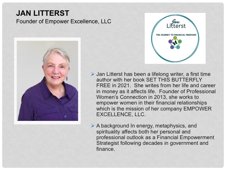 EXCEL: EXCEL begins with your enrollment in THE EMPOWER PROGRAM. “SET THIS BUTTERFLY FREE…Transforming Your Relationship with Energy, Money, and Life”, published in late 2021, is shipped to you as a beginning step to start THE EMPOWER PROGRAM. Created in less than 110 pages, it is your guidebook to the “one-step-at-a-time process” you can use to familiarize yourself with the Energy Circle
