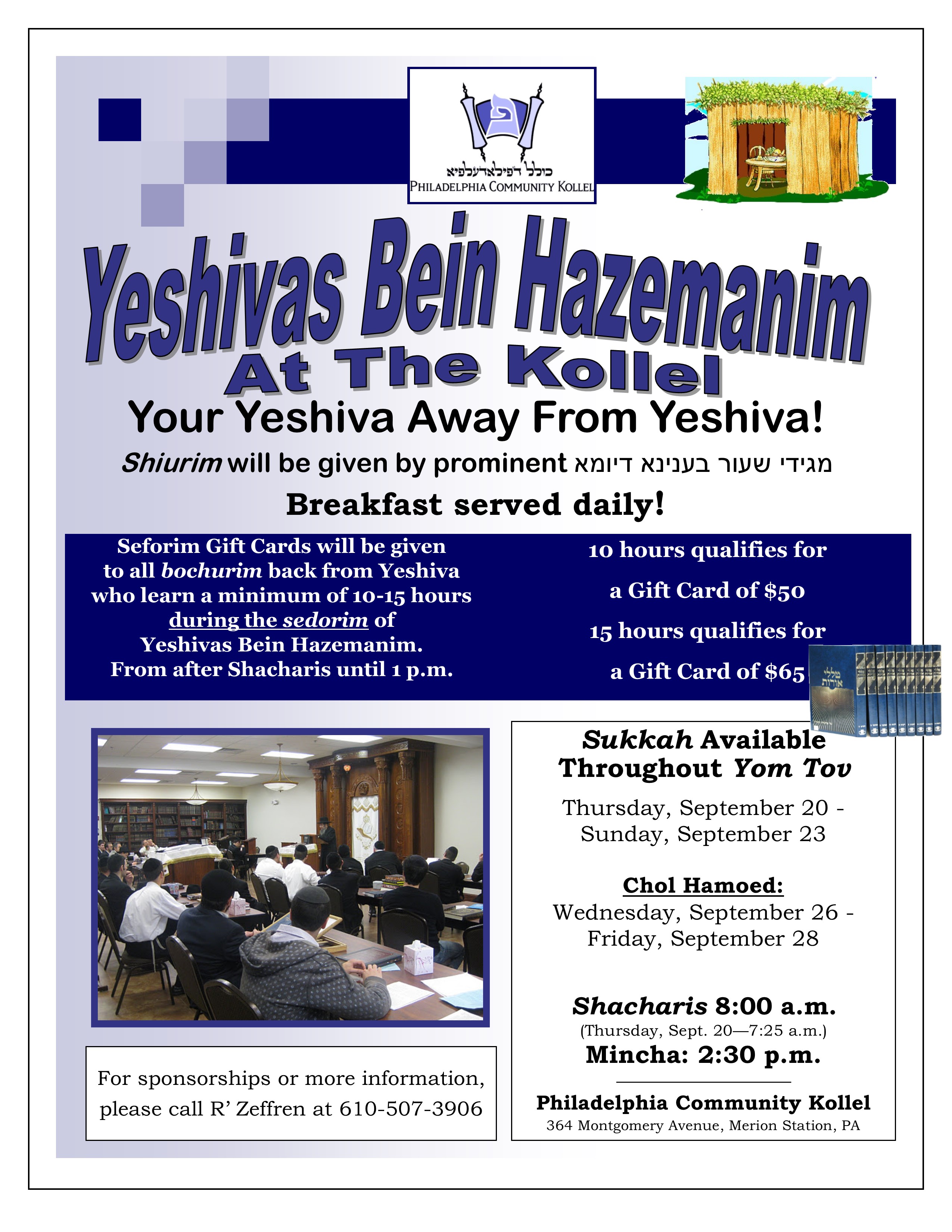 The Kollel is once again hosting Yeshivas Bein Hazemanim. Please see below for details of this program. Breakfast will be served. A sukkah will be available throughout Yom Tov.