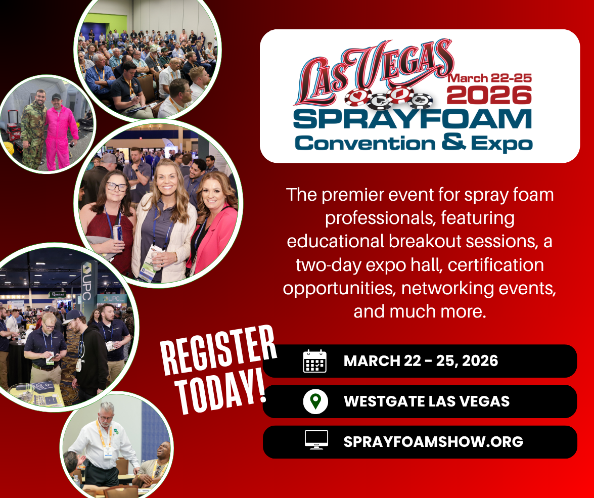 Don’t miss SprayFoam 2026 in Las Vegas! The #1 event for spray foam pros with educational breakout sessions, a two-day expo hall, certification activities, networking, and more.