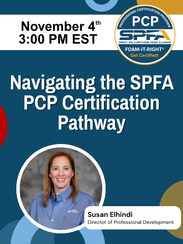 Learn more and register at SprayFoamShow.org or contact Susan Elhindi, Director of Professional Development, at certdirector@sprayfoam.org.