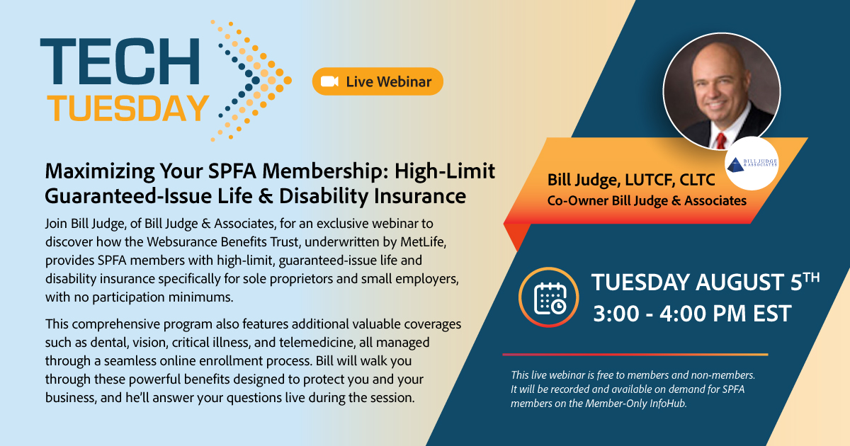 Join Bill Judge, of Bill Judge & Associates, for an exclusive webinar to discover how the Websurance Benefits Trust, underwritten by MetLife, provides SPFA members with high-limit, guaranteed-issue life and disability insurance specifically for sole proprietors and small employers, with no participation minimums.