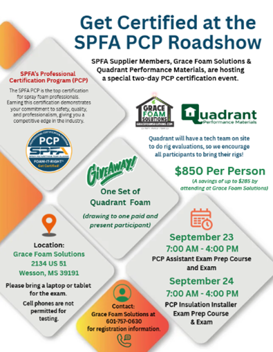 Grace Foam Solutions and Quadrant Performance Materials are organizing a special PCP certification event in Wesson, Mississippi, as part of the SPFA Professional Certification Program (PCP) Roadshow series.