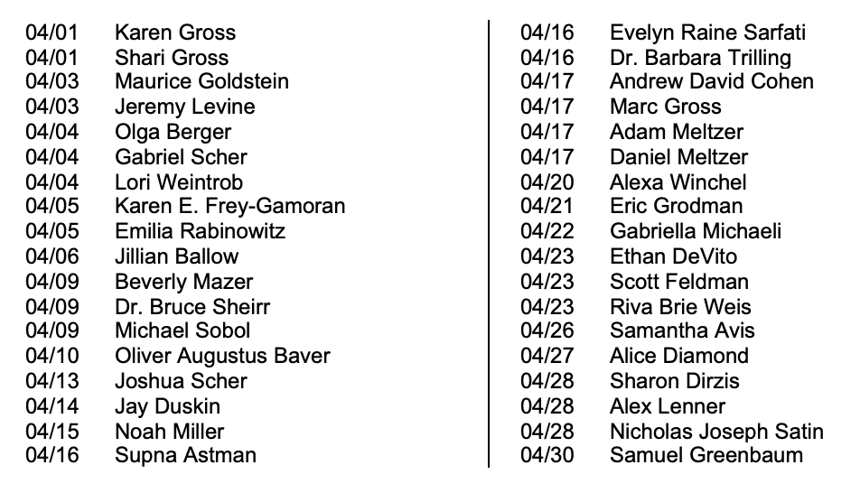 We continue to look forward to seeing you all at the children’s services on the first of every month. We hope you all attend with your lovely children! On Saturday, April 5th, we are having a wonderful Saturday morning service for all the children. And there will be a wonderful bagel Breakfast at 9:30 before the 10:30 service. If you are planning to join us early for the breakfast, please RSVP to JSiegel23@aol.com.
