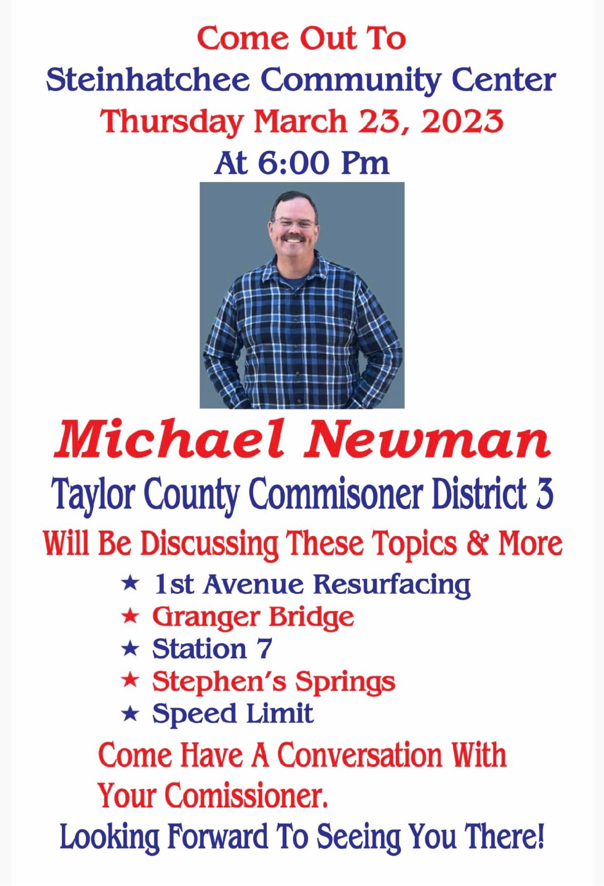| Steinhatchee locals! Our County Commissioner, Michael Newman will be discussing important topics on March 23rd at the Steinhatchee Community Center. Come on out! | |