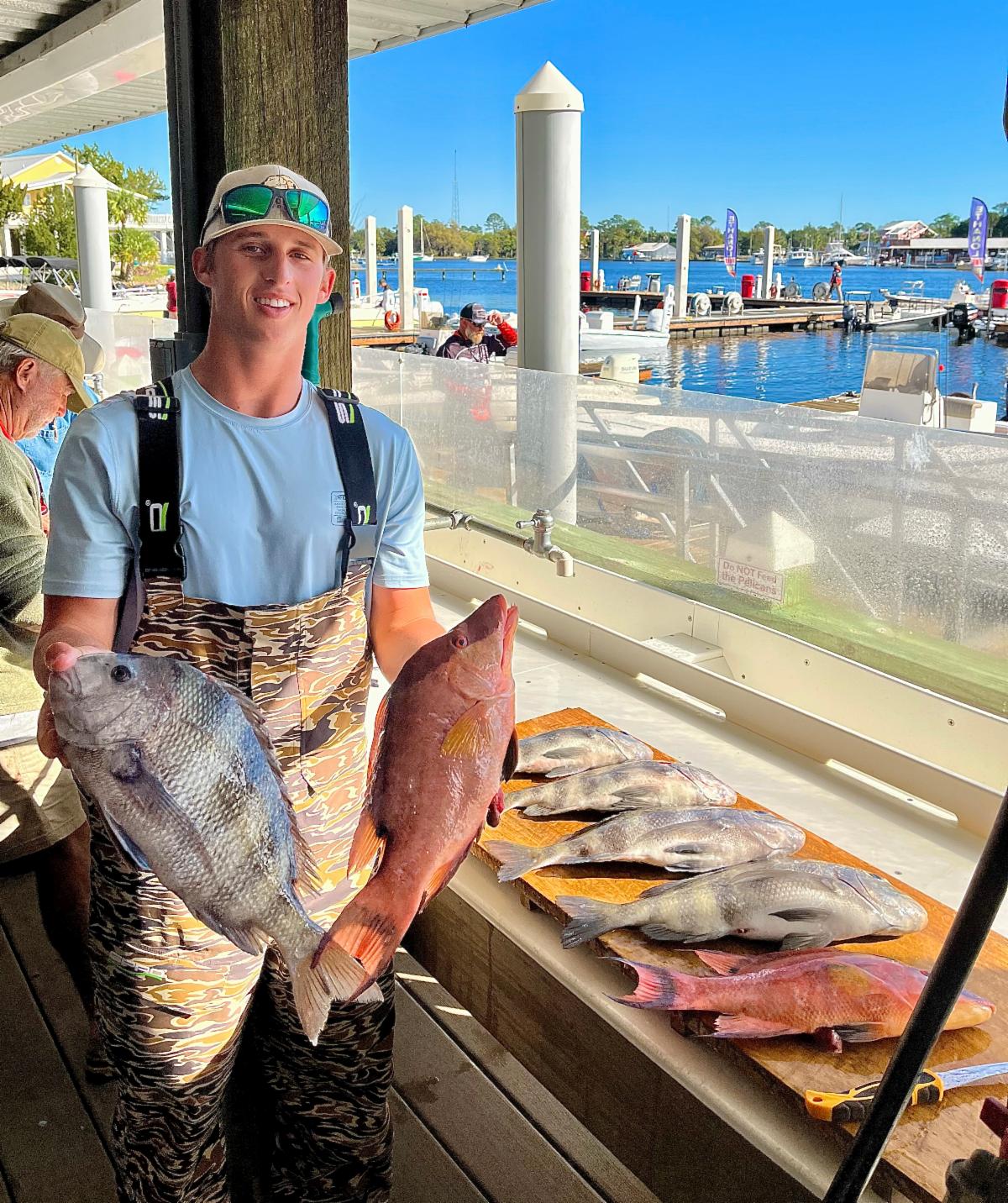 | Carson St. Laurent was getting ready to clean some sheepshead & hogfish from the Chase N Fish Crew's haul. | John was all smiles with his inshore slam! | |