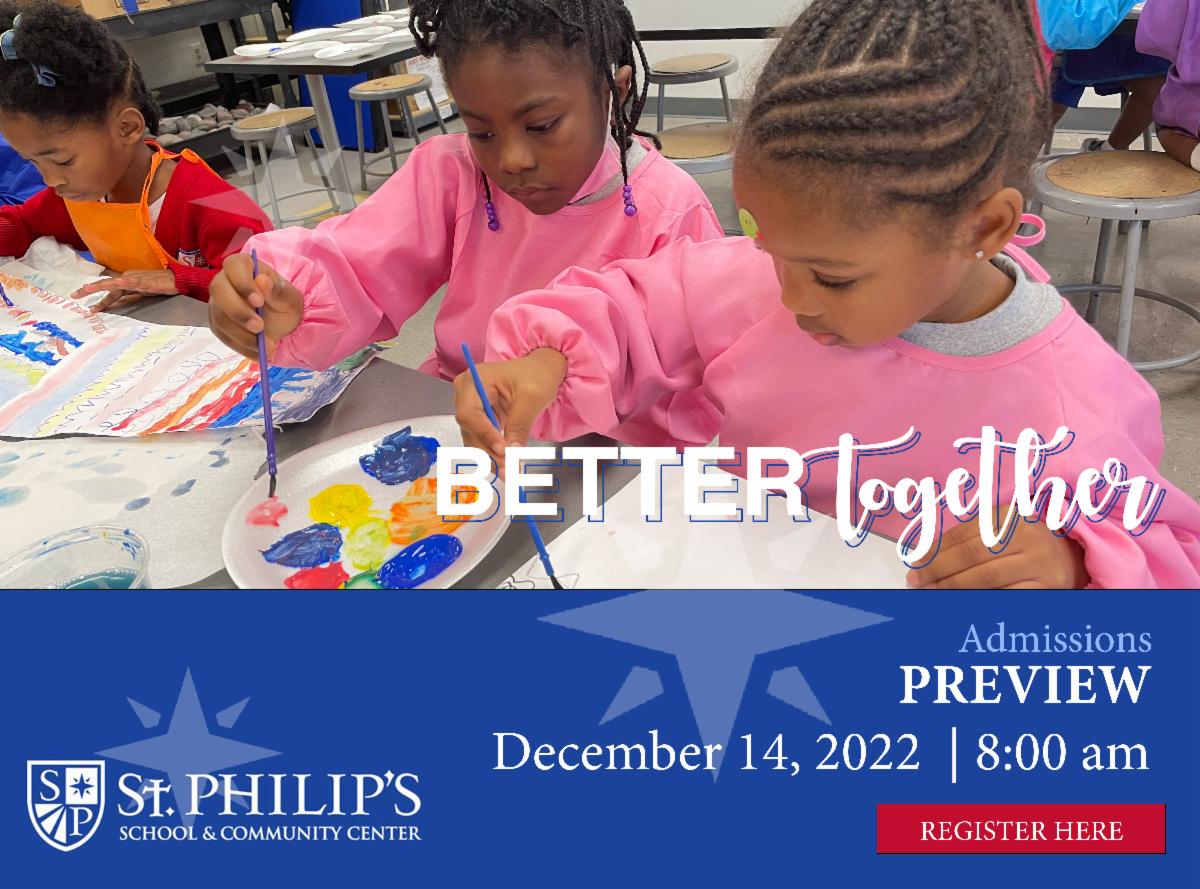 Learn why your family belongs at St. Philip's during our Admissions Preview on December 14, 2022 from 8:00am to 10:00am. We'll discuss our curriculum which gives students hands-on learning experience in the areas of math, science, social studies, technology, foreign language and performing arts.
