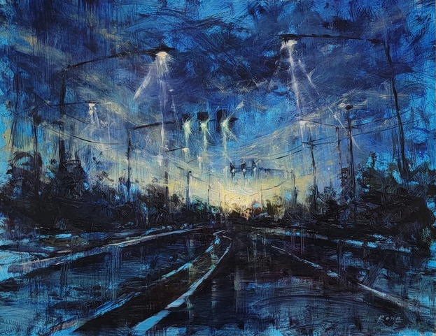 This demo delves into the moody magic of nocturnal landscapes - city streets shimmering after rain as day slips into night. At dusk, streetlights glow like gemstones in the light, wet pavement mirrors the atmosphere, and power lines add rhythm and depth. I’ll share my go-to substrates, brushes, paints, and mediums for this style; we’ll explore composition, value, and a rich yet simple palette. You’ll learn how to make those streetlights pop and reflections glisten, as we move between loose, painterly brush strokes and soft edges, balanced by crisp geometry and hard edges.