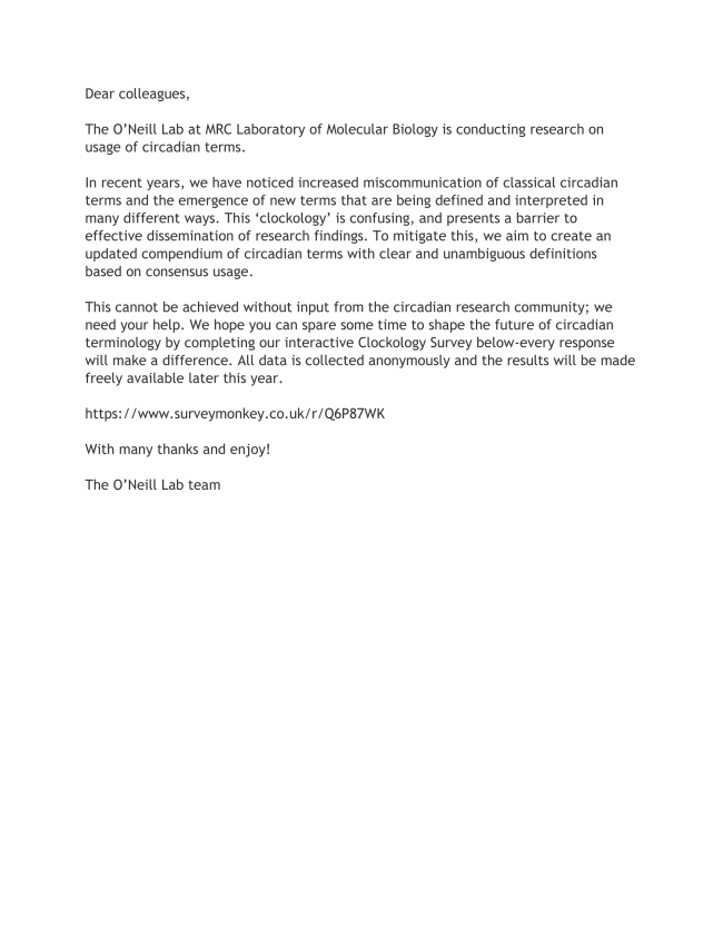 The O'Neill Lab at MRC Laboratory of Molecular Biology is conducting research on usage of circadian terms. Please click here for more information on this research.