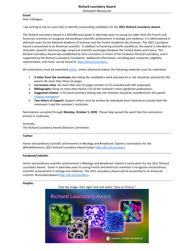Nominations are invited for the Richard Lounsbury Award in Biiology and Medicine.