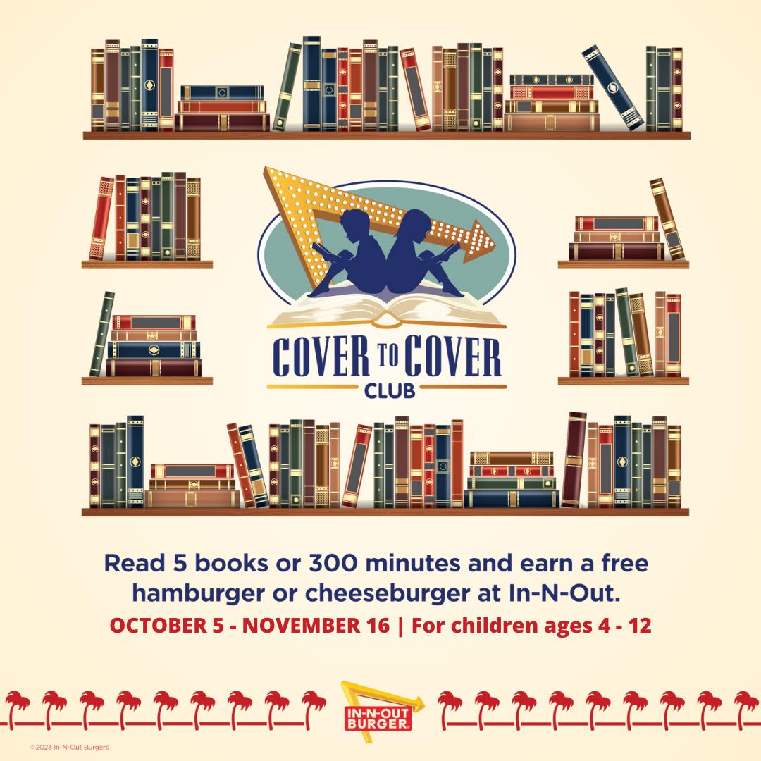 The In-N-Out Cover to Cover reading program is back! Children will receive an award of one free hamburger or cheeseburger for every five books or 300 minutes read, up to three awards!