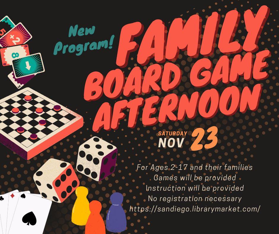 Family Board Game Afternoon: Saturday, November 23; for children ages 2–17 and families. Fun-filled afternoon playing award-winning board games. In partnership with Toy Hermit.