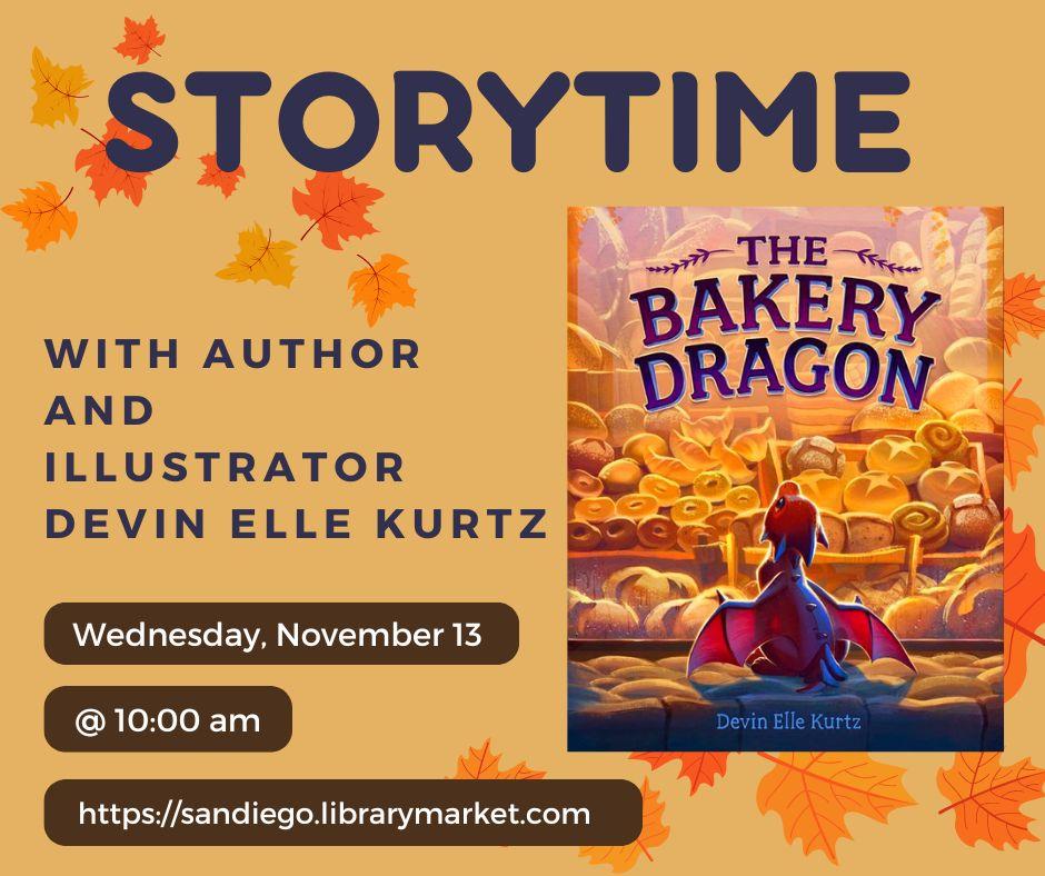 Storytime with Author Devin Elle Kurtz: Wednesday, November 13, 10 am. A visual development artist, illustrator, and lead background artist on the Netflix animated series, “Disenchantment,” Devin will read her picture book, The Bakery Dragon, at this special storytime event.