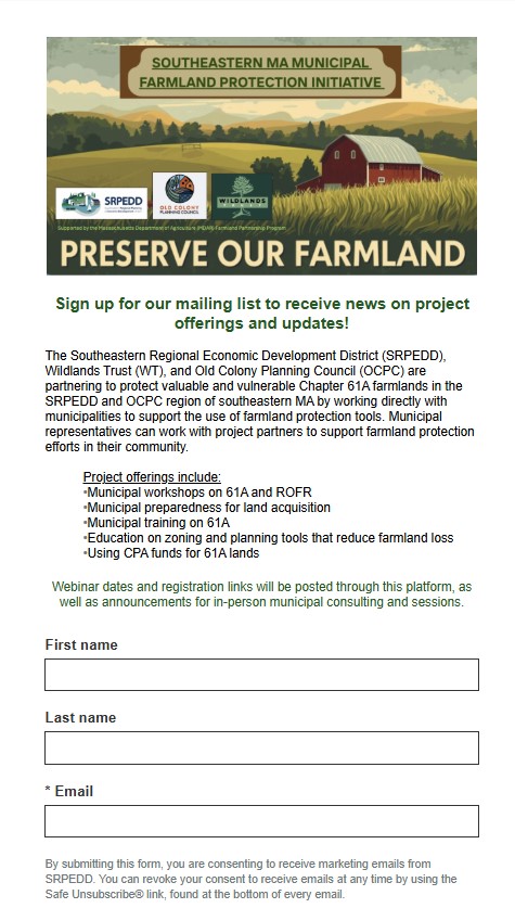 SRPEDD, partnering with Wildlands Trust and Old Colony Planning Council, has officially launched the Southeastern MA Farmland Protection Initiative, a regional effort to strengthen municipal capacity to protect farmland across 44 communities in Bristol, Plymouth, and Norfolk Counties.