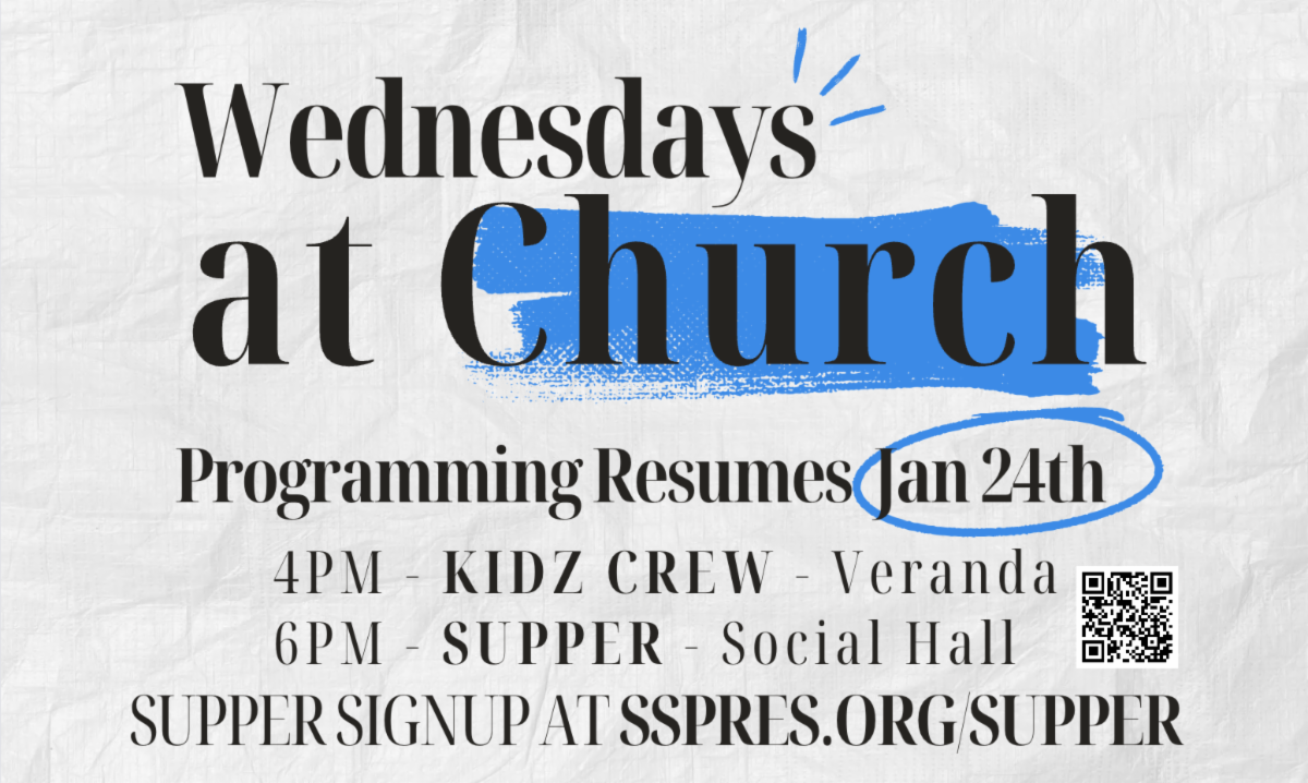 • Wednesday Night Suppers will resume at 6PM next Wednesday, January 24.
