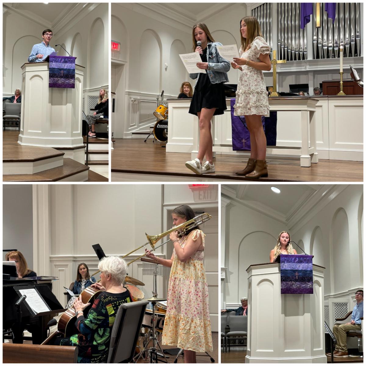 Thanks to the youth who provided extra special music – Emmeline Griffith, trombone; Ethan Tsai, Drums; Chase Busby, Ethan Tsai, Liam Holland, and Graham Holland, handbells. I’m certainly proud of all the youth who sang the songs for the service. Thank you to Lindsey Holland for playing the flute, as well. It was a great day of worship!