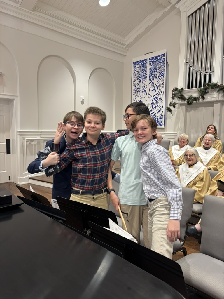 …..And, we’re off and running. All groups have now begun practicing music to be shared in the future. Why join a choir or ensemble? Because it’s fun, it puts us with people that love the art as much as we do, and it helps with self-expression – the Praise of God is the umbrella to all of these reasons! The joy of making music is evident in the photo below of our youth ensemble boys. I don’t think I could have asked a better group of people to help us enhance worship on January 5th. The Chancel Choir enjoyed their presence and excellent musicianship as well. L to R in photo – Graham Holland, Finger Cymbals; Liam Holland, Chimes; Ethan Tsai, Snare Drum; and Chase Busby, Crash Cymbals. Amy Bishop played a jazzy rendition of “Go Tell it on the Mountain” to lots of applause for the prelude and we had some guests in the choir, as well. Ruth Ryberg and John Sergey’s son John added beautifully to our regulars and returning snowbirds (Craig Endicott, Wanda Guokas, and John Sergey).
